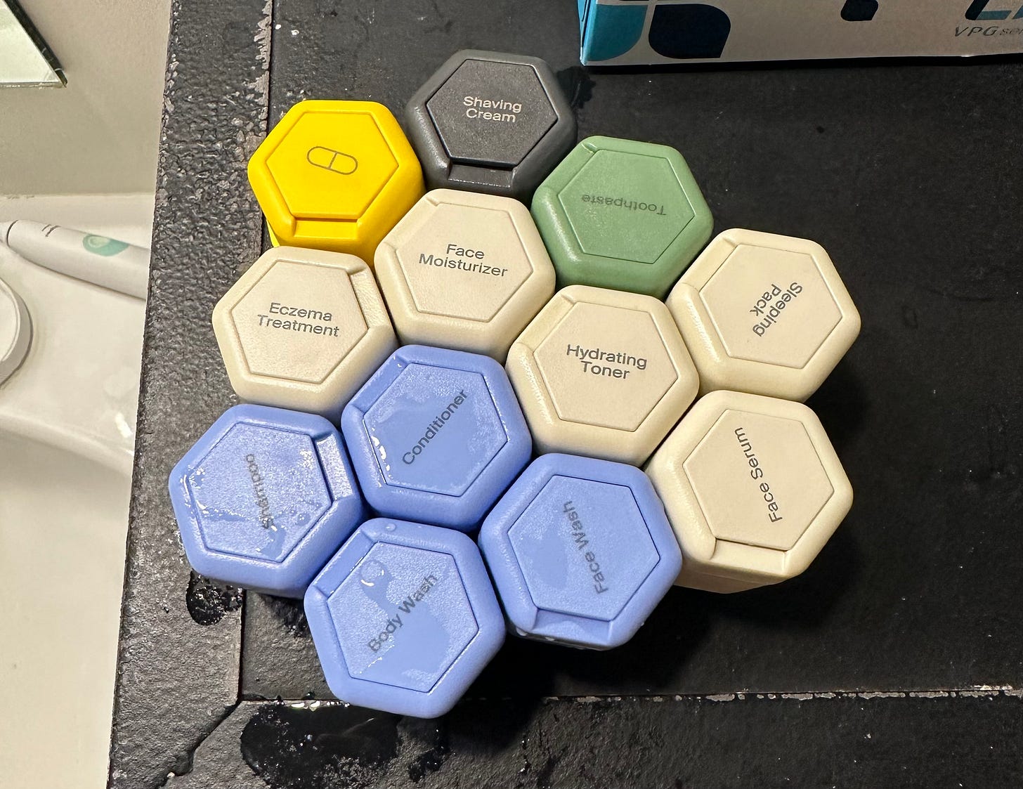 I was able to pack my full routine. This made packing far less stressful & the trip more enjoyable because my skin remained happy and hydrated the whole time. The capsules’ small size & interlocking hexagonal shape (each only holds .56 oz of liquid) made it feasible to bring way more products than I could have otherwise in the 3 oz travel tubes I was using previously.